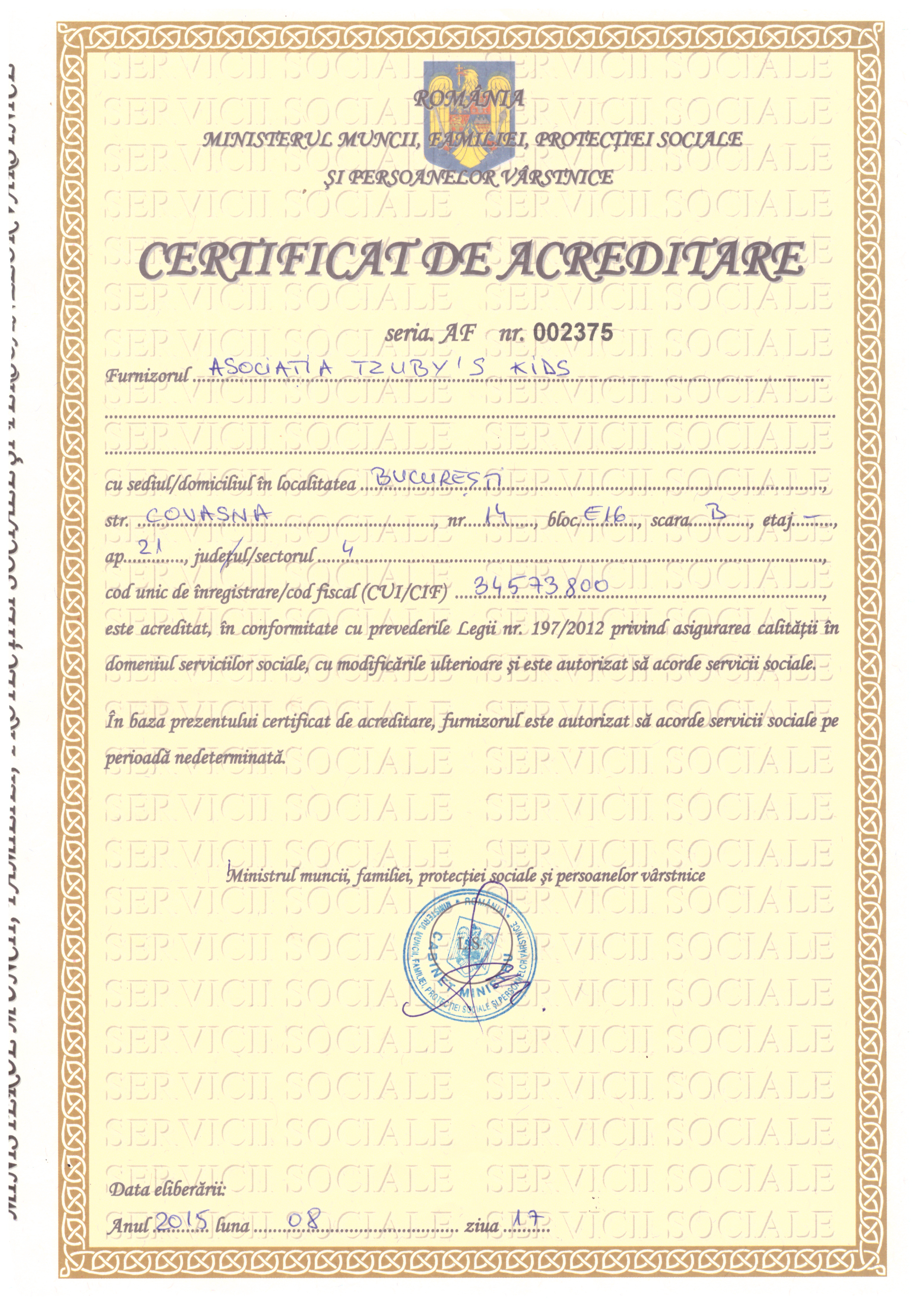Certificatul de acreditare a fost emis de Ministerul Muncii, Familiei şi Protecţiei Sociale în baza deciziei 2462 din 17.08.2015.